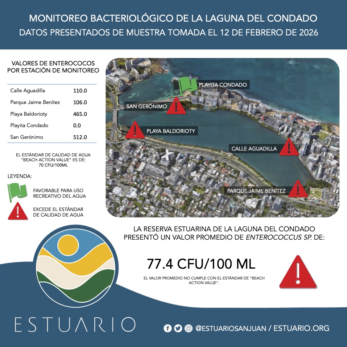 Evaluación realizada el jueves, 12 de febrero de 2026. Tenemos bandera ROJA para la Laguna del Condado. Recomendamos evitar las regiones que excedieron el parámetro de calidad de agua «Beach Action Value» para enterococos de 70 CFU/100 ML. Recuerden evitar el agua durante eventos de lluvia. Buen fin de semana.