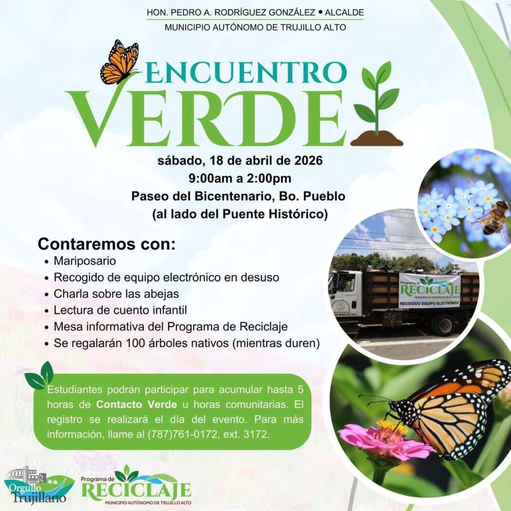 El sábado, 18 de abril, Estuario también estará presente en el Encuentro Verde del Municipio de Trujillo Alto, de 9:00 a.m. a 2:00 p.m. en el Paseo del Bicentenario, Barrio Pueblo (al lado del Puente Histórico). Habrá un mariposario, recogido de equipo electrónico, charla sobre las abejas, lectura de un cuento infantil e información sobre el programa de reciclaje municipal. Se regalarán 100 árboles nativos.