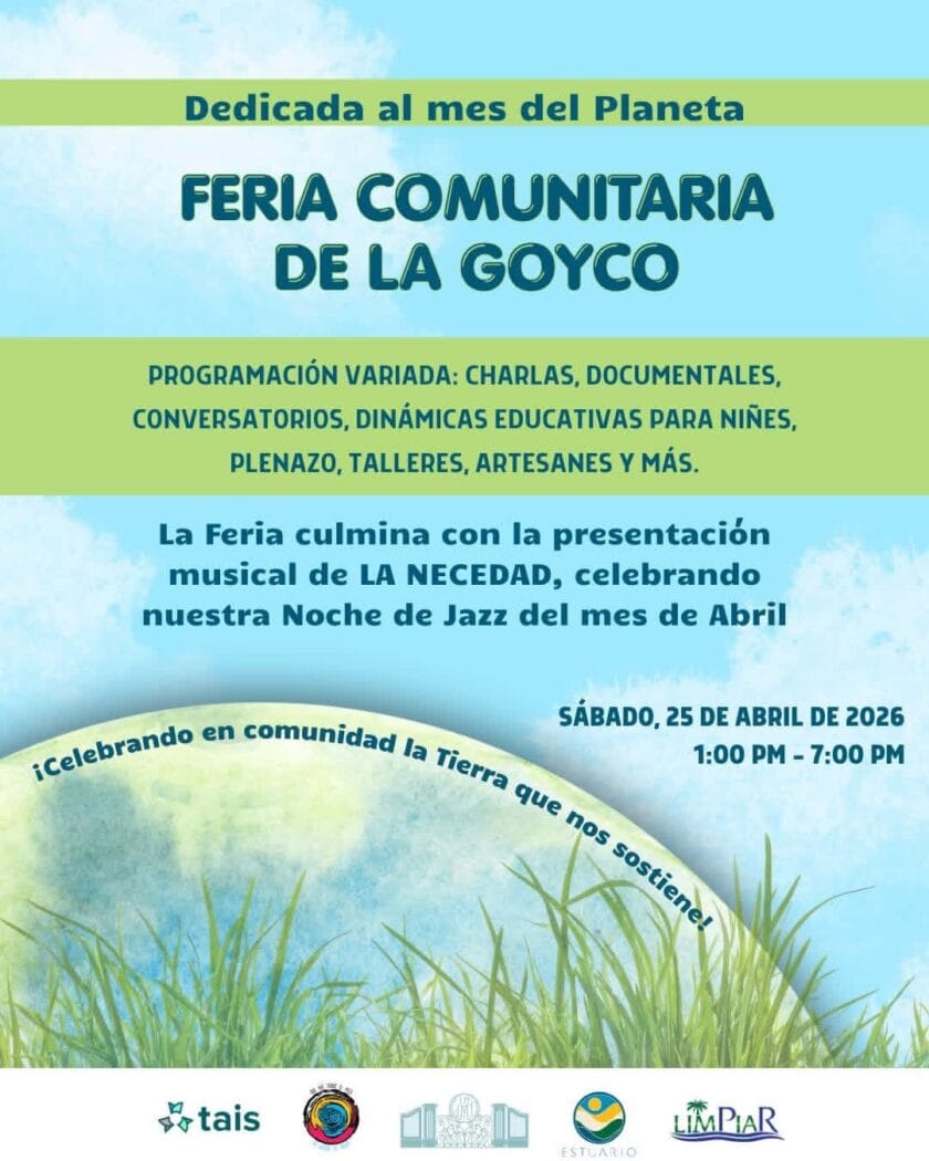 La Feria Comunitaria de Taller Comunidad La Goyco será el sábado, 25 de abril, de 1:00 p.m. a 6:00 p.m., dedicada al Día Mundial del Planeta Tierra. Habrá talleres, lectura de cuentos, música, un conversatorio sobre composta, proyección y conversatorio del documental, The Rights of Nature; charlas y más. Estuario estará presente con una mesa informativa.