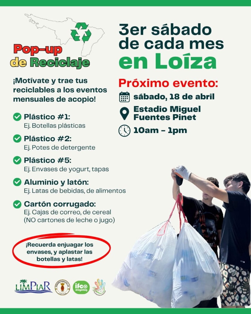 El Pop-up de Reciclaje en Loíza ocurre el tercer sábado de cada mes. Se desvía plástico #1, #2 y #5, aluminio, latón y cartón corrugado. Organizan LimPiaR, Tais y el Municipio de Loíza.